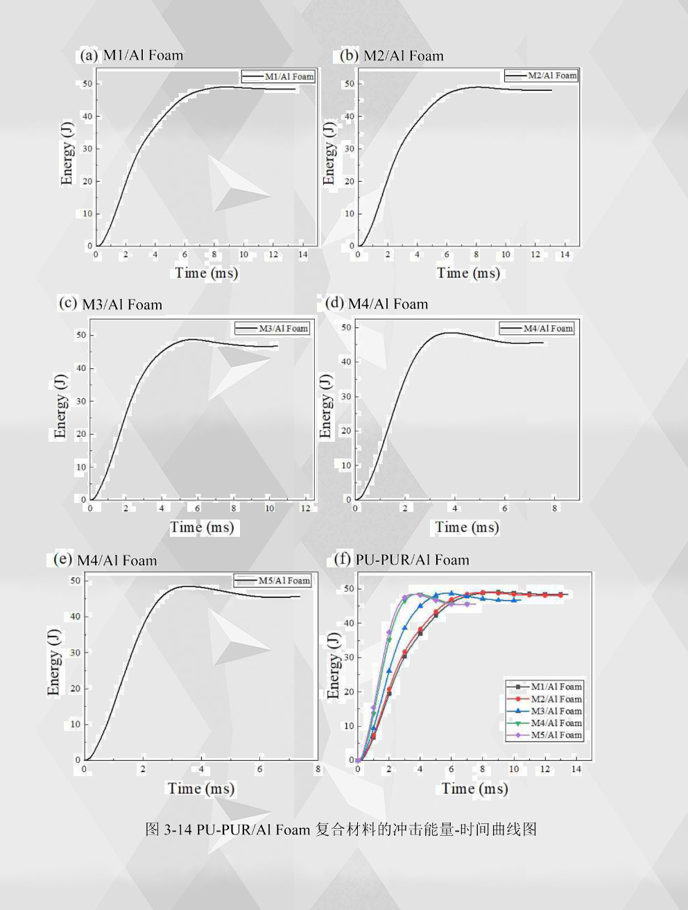 在第三个阶段,冲击能量有少量减少,这是由于冲头冲击复合材料后发生了回弹, 大部分的冲击能量被复合材料所吸收,而有少量能量没有被复合材料吸收,这部分能量 就是回弹能量,回弹能量在能量-时间上表现为峰值能量和稳定能量的差值。从吸收能量来看 ,M1/Al Foam和M2/Al Foam吸收能量分别为48.413J和48.076J,其回弹能量分别为0.666J和0.938J,其吸能比达到了98.64%和98.09%。树脂中聚脲含量较高的M4/Al Foam和M5/Al Foam的复合材料吸收能量分别为45.466J和45.427J,其回弹能量分别为3.052J和3.049,其吸能比达到了93.71%和93.71%。而对于M3/Al Foam复合材料,即树脂中聚氨酯和聚脲含量都为50%时,其吸收能量为46.666J,其回弹能量为2.096J,其吸能比为95.70%。