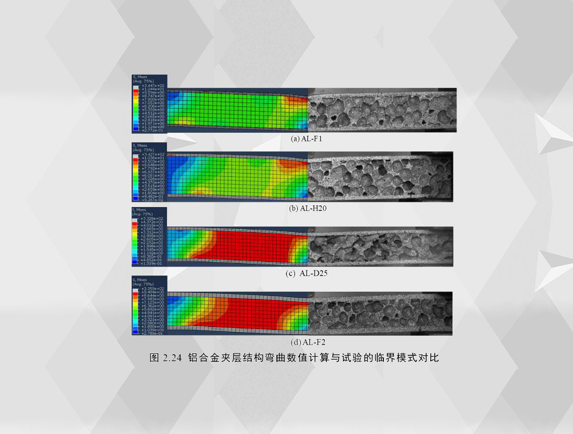 图2.24为计算所得的泡沫铝夹层结构在弯曲位移约为3mm时的变形模式云图与试验所得的临界失效模式图对比。从各图变形对比可以看出,数值模拟得到的失效模式和试验的临界失效模式基本一致,AL-F1和AL-H20为压痕压入(IN),AL-D25和AL-F2 为芯层剪切(CS)。