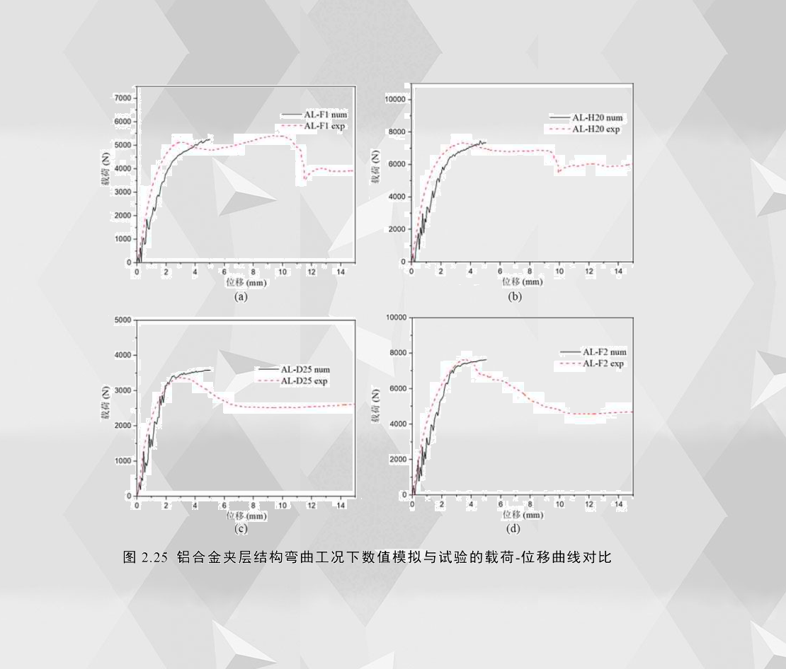 图2.25展示了四种试件在弯曲位移0至5mm的数值模拟载荷-位移曲线及其相应的实验曲线,其中(a)和(b)的临界失效模式为压痕压入(IN),(c)和(d)为芯层剪切(CS),图中曲线均为原始数据,未作滤波处理。