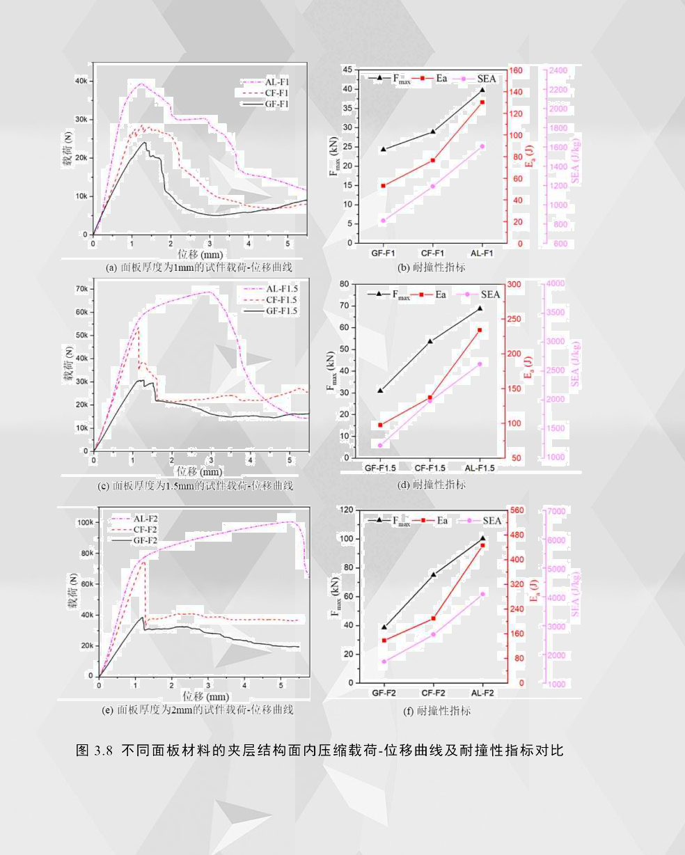 通过比较面板厚度相同但材料不同的夹层结构载荷-位移曲线,如图3.8所示,可发现铝合金夹层结构的曲线高度明显高于同等面板厚度下的纤维增强夹层结构。由于铝合金面板的弹性模量比纤维增强复合材料的大,所以夹层结构在第一阶段(弹性阶段)的斜率最大,即刚度最大。从基材力学测试的数据可以看出,铝合金面板的极限强度比纤维增强复合材料面板的强度要低,但通过耐撞性指标可以看出,铝合金夹层结构具有最大的峰值力,造成这种现象的主要原因是由于面板为脆性材料的纤维增强夹层结构的上、下面板之间尺寸误差或装配误差的叠加效应对载荷的损失比面板为弹塑性材料的铝合金夹层结构的要大得多,而这种叠加效应对弹塑性材料的极限承载能力影响非常小,从而解释了铝合金夹层结构比纤维夹层结构具有更大的极限载荷。此外,在纤维增强夹层结构的失效过程可以看出,纤维增强夹层结构面板的脆性断裂通常首先仅发生在某一面板,而不是两面板同时脆性断裂,这也解释了面板叠加效应的存在。通过不同面板材料的夹层结构面内压缩的耐撞性指标比较可以看出,在具有相同尺寸配置的前提下,铝合金夹层结构有最好的耐撞性能,而玻璃纤维夹层结构有最差的耐撞性能。