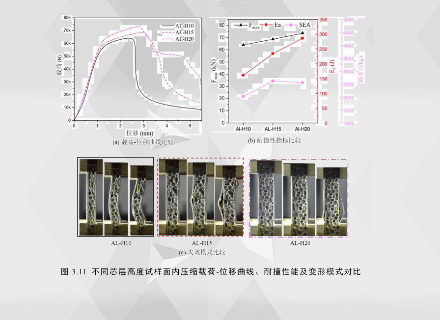 从其耐撞性指标图3.11(b)中可以看出,铝合金夹层结构的峰值载荷及总吸能随芯层高度的增加而增加,而其比吸能的变化趋势则不然。当夹层结构的芯层高度从10mm增加到15mm,试件在第三阶段的主要失效模式由整体屈曲变为面板屈曲,芯层破坏方式也发生了变化,由于后者的失效模式吸收的能量比前者多很多,所以即使结构的重量有所增加,但AL-H15的比吸能(SEA)仍比AL-H10高。而当夹层结构的芯层厚度从15mm增加到20mm时,试件在第二、三阶段的主要失效模式基本未发生变化,虽说后者在第三阶段的吸能会更多一些,但毕竟总吸能提高的幅度有限,所以AL-H15比AL-H20的比吸能(SEA)更高。