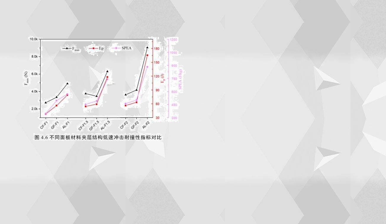 为了更为直观地比较不同面板材料的夹层结构的抗冲击性能,图4.6比较了相同面板厚度但面板材料不同的夹层结构的耐撞性指标,通过比较可以看出,铝合金夹层结构有最优的耐撞性能,其临界穿透能高达118J,初始峰值载荷高达6297N;而碳纤维增强夹层结构的耐冲击性能明显低于铝合金夹层结构的,其临界穿透能和初始峰值载荷分别为54J和3752N;而与碳纤维增强夹层结构相比,玻璃纤维的耐碰撞性略有提高,其临界穿透能为59J。此外,根据三者完全穿透试件的载荷-位移在第一阶段的斜率可以看出,如图4.5(d),铝合金夹层结构的斜率最大,也就是说,在低速冲击工况下,铝合金夹层结构的刚度大于纤维增强夹层结构的刚度。通过观察面板厚度为1mm和2mm试件的耐撞性指标,也可以知道,在低速冲击工况下,铝合金夹层结构有最好的耐撞性能,而碳纤维夹层结构的耐撞性能在三者几乎是最差的。