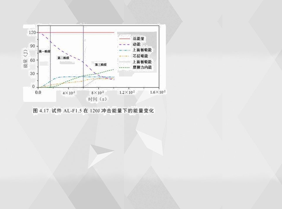 图4.17为试件AL-F1.5的各组成部分在低速冲击仿真中能量变化。从图中可以看出,初始冲击能量主要由上下面板、泡沫铝芯层的内能以及各组成部分的摩擦能四部分组成。从各部分能量转化趋势可以看出,整个冲击过程基本可以分为三个阶段。第一阶段主要由上面板吸收能量,摩擦力做功较少。第二阶段摩擦力做功迅速增加,成为主要吸能部分。第三阶段由于下面板发生较大塑性变形,下面板成为主要吸能部分。