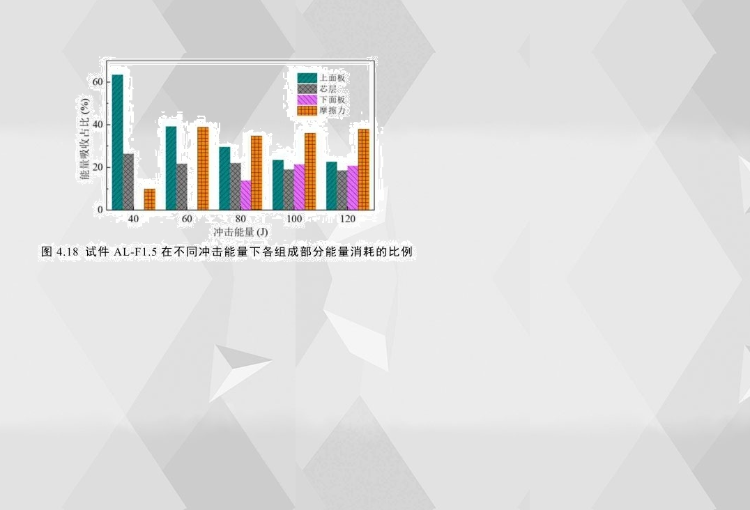 图4.18为AL-F1.5在不同冲击能量下各组成部分能量吸收的比例。上面板消耗的能量比例在小能量(40J)冲击下最大(高达64%),芯层耗能占比为26.5%,因此在小能量冲击下,增强上面板和芯层的防护更能提高结构的耐冲击性能;当下面板完全穿透时,摩擦力消耗的能量占比最高(约为38%);有趣的是,在各冲击能量下,泡沫芯层吸能占比均在20%左右;此外还发现,无论夹层结构穿透与否,上面板的耗能占比均大于下面板,这说明增强上面板更能提高夹层结构的耐冲击性。