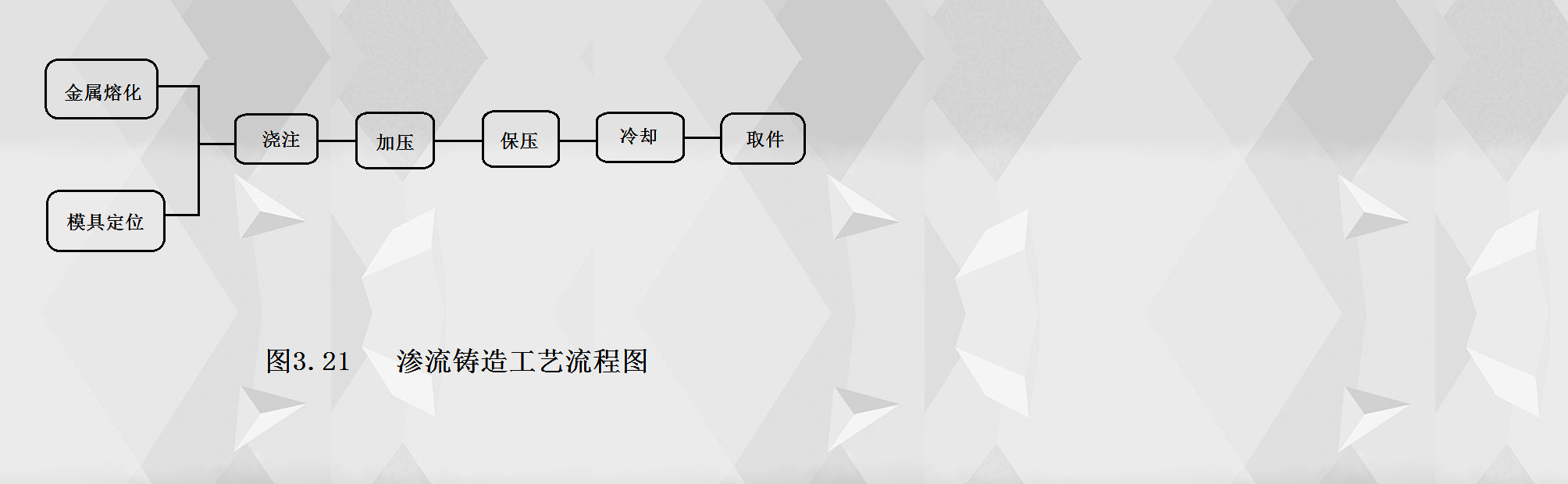 为顺利渗流,铝液应有一定的过热度,并保持一定时间,使金属液在一定压力下结晶,金属组织会更致密。加压速度要适当,过快可能建立不起压力,过慢会导致金属液凝固使渗流通道堵塞而不能成形。图3.21是渗流铸造工艺流程图。